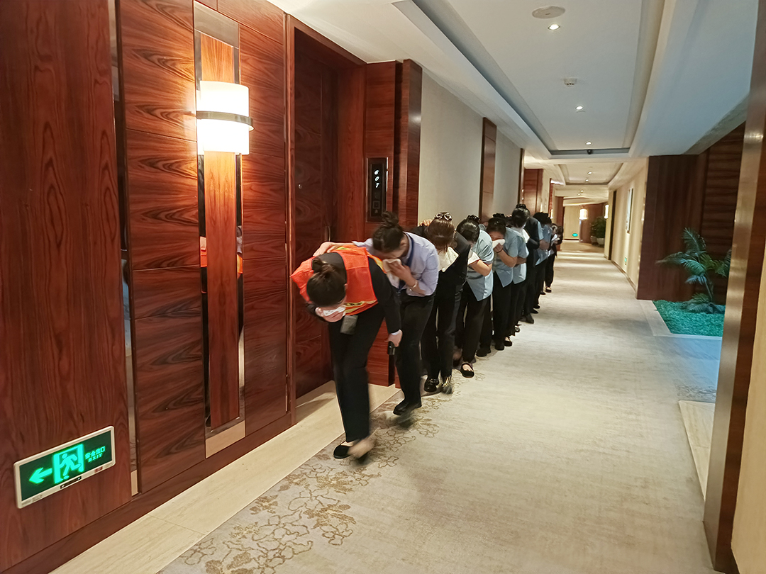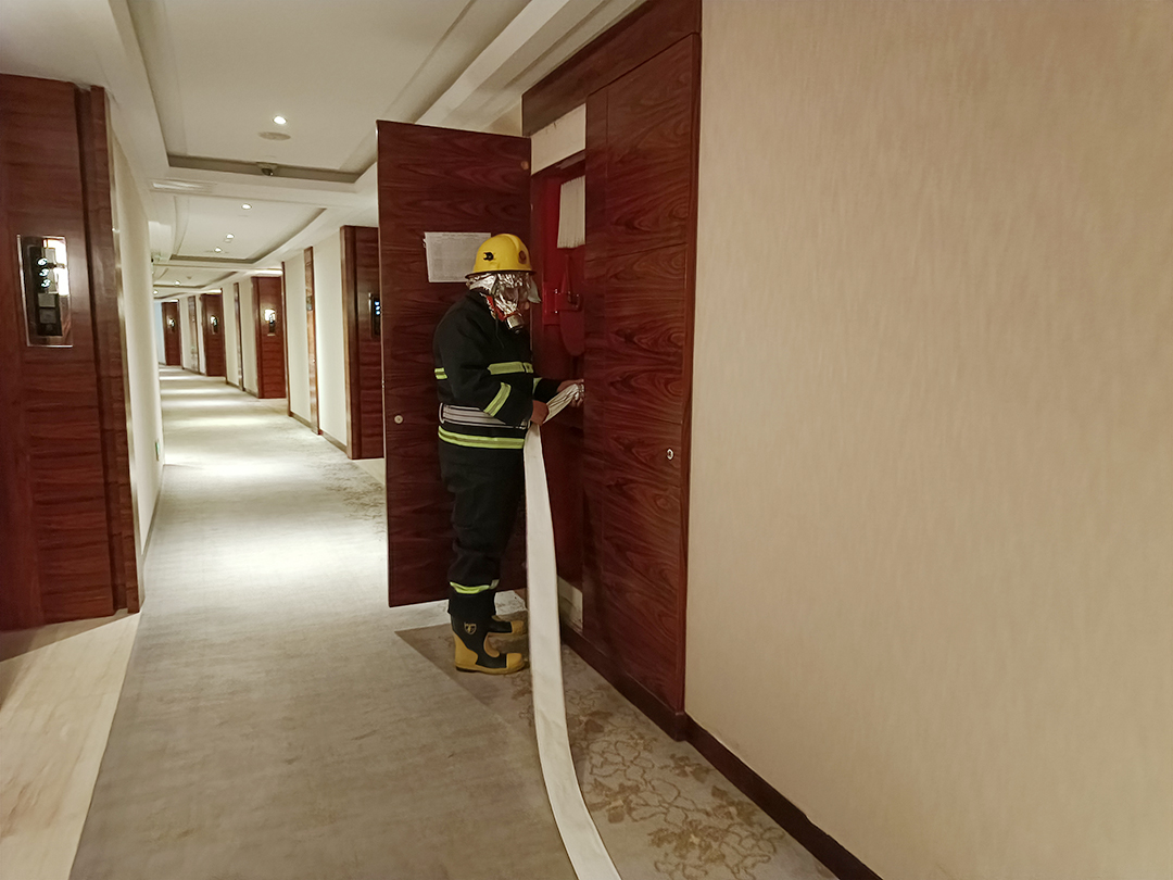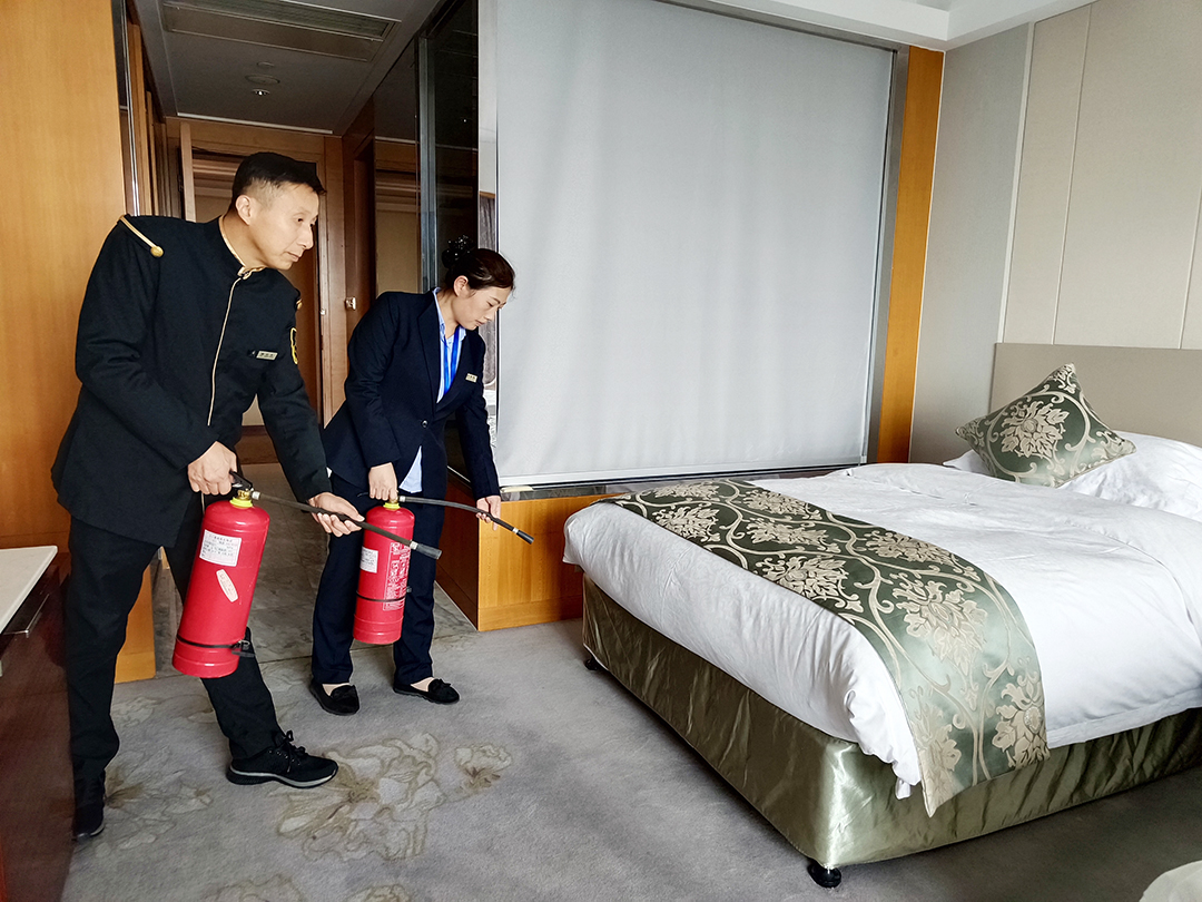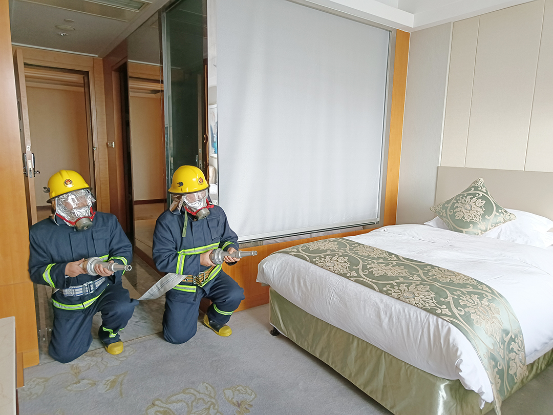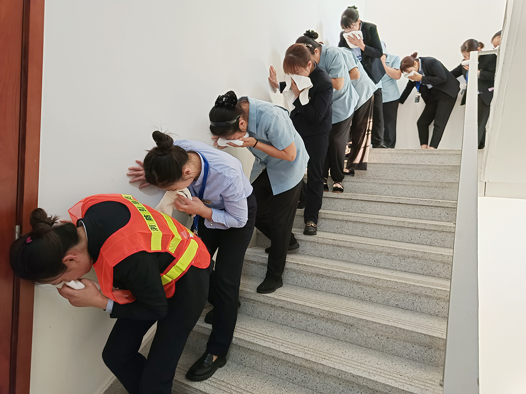▲消防灭火疏散演练培训 下午两点,酒店模拟628房间“起火”,随着消防警铃的响起,消防灭火疏散演练拉开序幕。按照演练预案,酒店消防员至628房间对起火点进行扑救,各部门管理人员立即组织本部门员工按照疏散要求,迅速捂住口鼻,低头弯腰伏身,紧张有序地按照预定疏散路线撤离“火灾”现场。